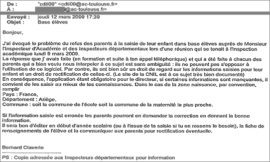 6. Les courriers adressés par de nombreux parents aux inspecteurs d’académie demandant de ne pas entrer les enfants dans la Base élèves ou d’annuler les saisies pour non respect de l’obligation d’information préalable des parents restent sans réponse de la part de l’Education Nationale. Pour contourner les familles refusant de remplir les fiches de renseignement devant servir de base à l’établissement du numéro d’identification de l’élève (INE), l’Inspection Académique de l’Ariège propose par exemple aux directeurs de remplir les champs manquants avec de faux renseignements, que les parents se verront donc contraints de faire corriger :