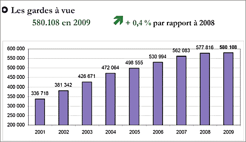 D’après les chiffres officiels, en huit ans le nombre des gardes à vue a progressé de 72 %, passant de 336 718 en 2001 à 580 108 en 2009. De 2008 à 2009, la progression ( + 0,4 %) est faible mais le nombre reste très élevé : chaque année, en dehors des jeunes enfants, plus d’une personne sur cent fait un passage en garde à vue.