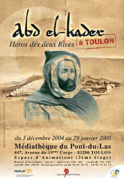 En février 2003, la section de Toulon de la Ligue des droits de l’Homme lançait l’idée d’une exposition sur l’Emir Abd el-Kader à Toulon. L’idée s’est concrétisée, en partenariat avec la mairie de Toulon, et avec le soutien du FASILD [1], du 1er décembre 2004 au 29 janvier 2005 à la Médiathèque du Pont du Las.