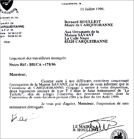 RESPONSABILITÉ PARTAGÉE »« La commune a sollicité les services de l’Etat dès 1991 pour que le projet de relogement de ces travailleurs soit pris en compte dans le Plan Départemental d’action ; et des démarches ont été menées auprès de divers organismes », avance le maire de Carqueiranne, Marc Giraud, vice-président du Conseil général et de TPM qui s’est récemment illustré par ses virulentes prises de position à l’encontre du quota de logements sociaux imposé par la loi SRU [3]. « Nous avons régulièrement informé les occupants, depuis décembre 2001, de l’imminence de cette fin de bail ». Sur l’insalubrité des locaux, il précise : « si responsabilité il y a, elle doit être régulièrement partagée... Le propriétaire, la commune et les occupants sont assurément tout aussi responsables de l’état actuel des locaux ».