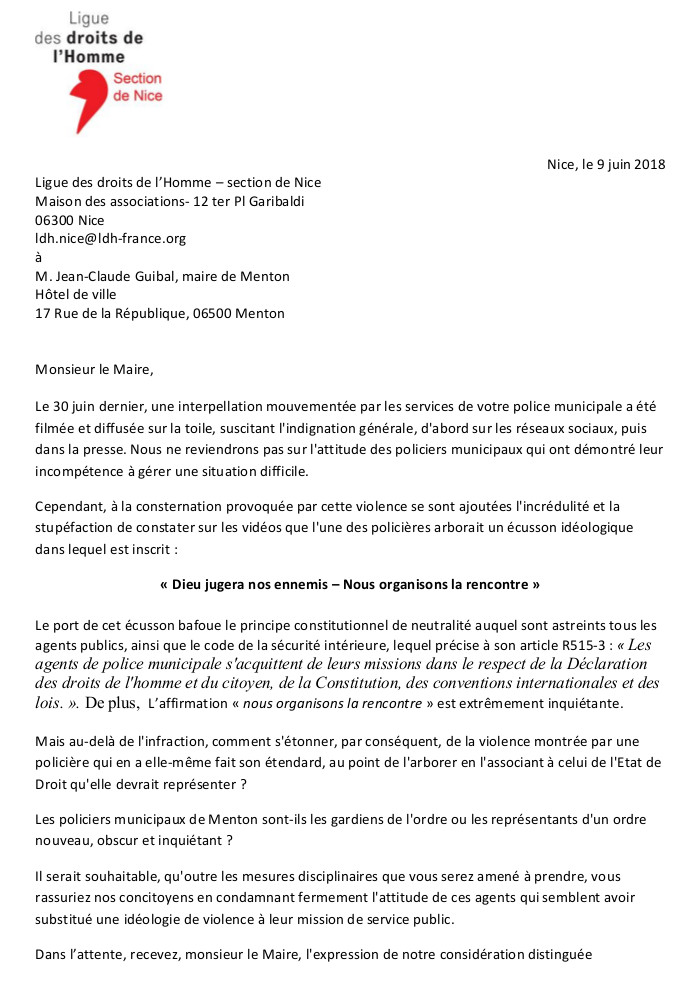 S’adressant au maire de Menton, la LDH Nice, rappelle que le 30 juin 2018, l’interpellation "mouvementée par les services de la police municipale" a suscité l’indignation de tous (vue sur les réseaux sociaux, dénoncée dans la presse).