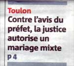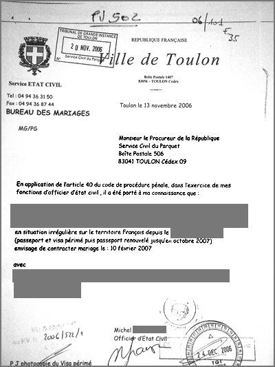 C’est alors que les choses se gâtent. Car, en mairie de Toulon, les consignes sont claires et précises : mariage « mixte » = mariage suspect = dossier à transmettre au procureur – rappelons que seul le procureur de la République a le droit de surseoir ou de s’opposer à un mariage. Mais, comme nous allons le voir, les services de la préfecture du Var savent tirer profit des bons rapports qu’ils entretiennent avec les services du parquet.