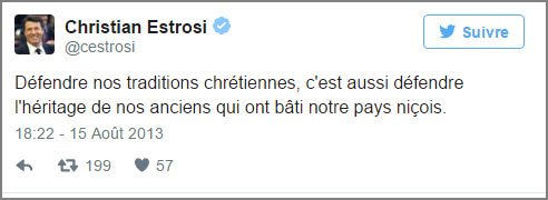 M. Christian Estrosi, député-maire UMP de Nice, président de la Métropole Nice-Côte-d’Azur, ancien ministre, qui dénonce souvent le communautarisme (concernant les musulmans), publie une photo datée du 15 août 2013, sur son compte Tweeter [@cestrosi], avec la légende : « Défendre nos traditions chrétiennes, c’est aussi défendre l’héritage de nos anciens qui ont bâti notre pays niçois.