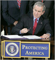 Assis derrière une table sur laquelle on pouvait lire "Protéger les Etats-Unis", à la Maison Blanche, M. Bush a défendu cette loi en estimant qu’elle était un « instrument vital » de la lutte contre le terrorisme. Il a réfuté qu’elle autorise la torture contre les terroristes présumés