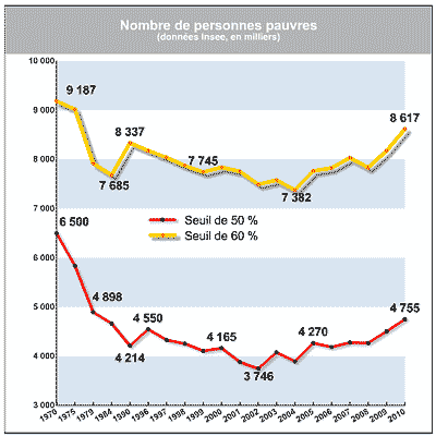 C’est le moment de la trêves des expulsions, c’est aussi le moment de faire les comptes de la pauvreté en France. Selon l’INSEE et l’observatoire des inégalités la France comptait 4,8 millions de pauvres en 2010 si l’on fixe le seuil de pauvreté à 50 % du niveau de vie médian et 8,6 millions de pauvres si l’on utilise le seuil de 60 % du niveau de vie médian [1].