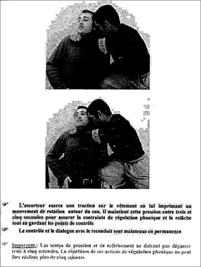 Ces techniques continuent à être enseignées. Pour s’en convaincre, il suffit de consulter le Manuel d’instruction relatif à l’éloignement par voie aérienne des étrangers en situation irrégulière qui est utilisé lors des stages de formation aux « gestes techniques professionnels en intervention » (GTPI) d’escorte [5]. En voici une page :