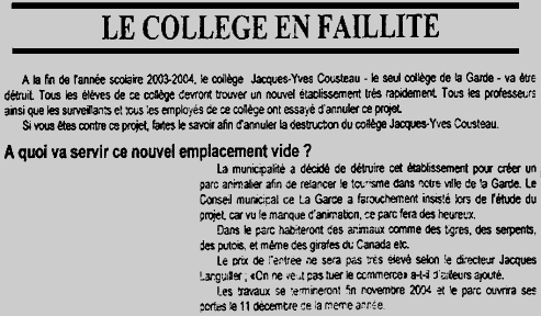 Peu de temps avant les élections cantonales les élèves d’une classe de quatrième du collège Jean-Yves Cousteau de La Garde publiaient le premier numéro de leur journal scolaire "le Hérisson des Mers". Une information de ce journal devait provoquer l’ire du premier magistrat : l’annonce que le collège serait détruit et remplacé par ... un "parc animalier".