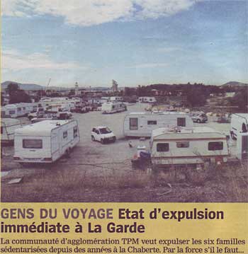 Depuis plusieurs mois, la situation des familles qui vivent en caravanes au lieu-dit la Chaberte, sur la commune de La Garde, se dégrade. Une demi-douzaine de familles de Gens du Voyage avec 17 enfants scolarisés sont sédentarisées depuis plus de 5 ans sur un terrain que la communauté d’agglomération Toulon-Provence-Méditerranée (TPM) leur a concédé par contrat et pour lequel elles paient une contribution. Or TPM a l’intention de transformer ce terrain en une aire de passage pour les Gens du Voyage nomades. L’intention est louable, encore faudrait-il que TPM propose aux occupants actuels un terrain comportant des installations sanitaires minimum, comme elle s’y était engagée.