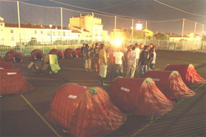 En quelques instants un alignement de tentes Quechua s’est déployé, autour d’un terrain omnisports cerné de barreaux. (Ph. Richard Ray)