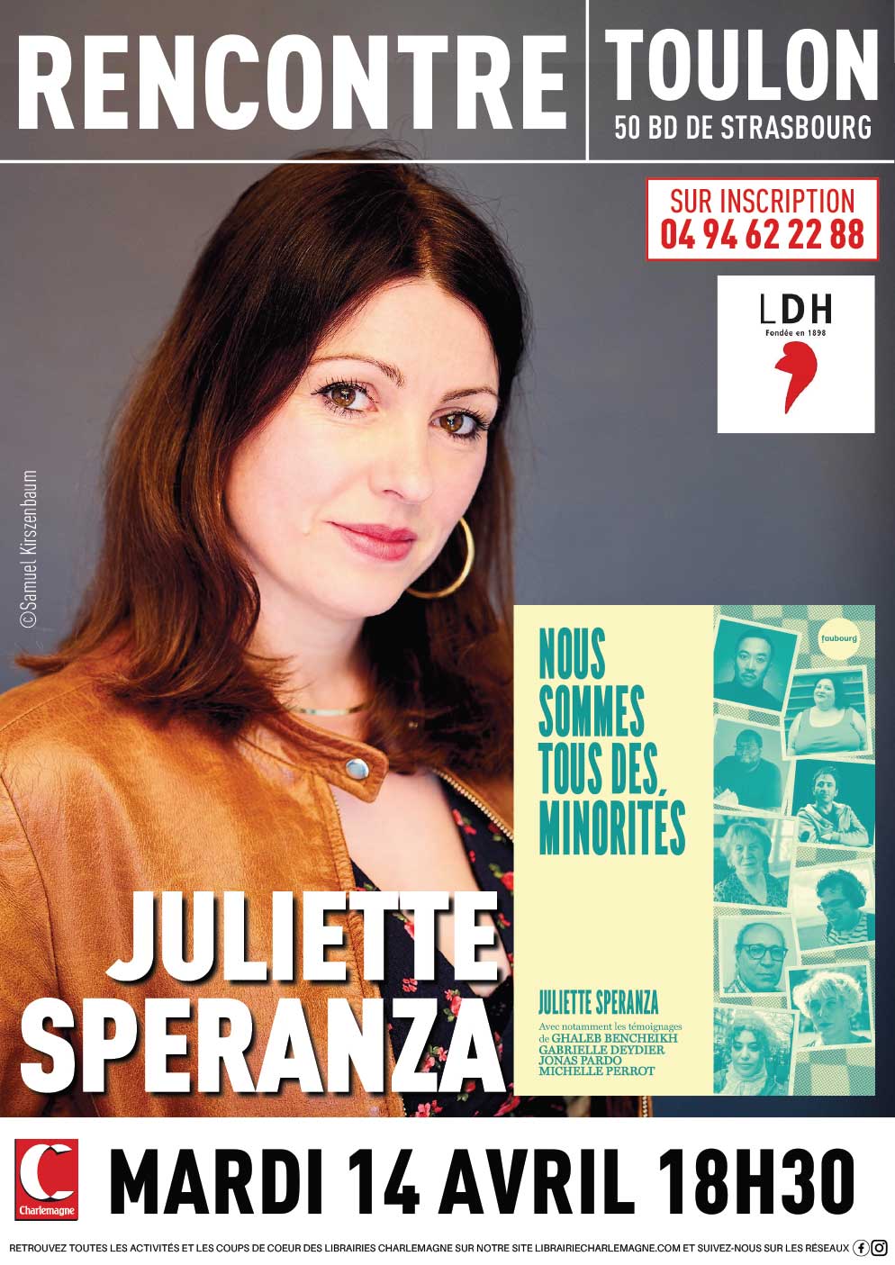 La librairie Charlemagne et La Ligue des Droits de l’Homme, section de Toulon Métropole accueilleront le mardi 14 avril à 18h30 Juliette SPERANZA pour la présentation de son livre « Nous sommes tous des minorités ».