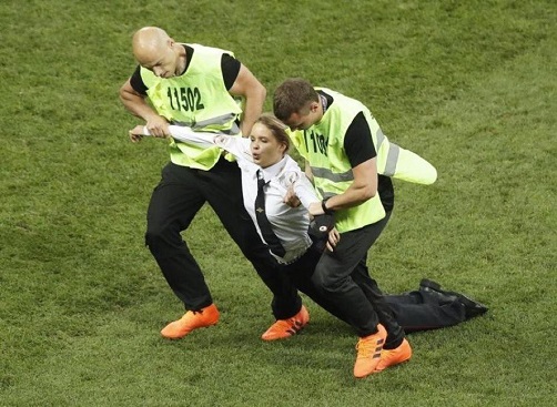 15/07/2018 : "4 Pussy Riot ont fait irruption dans le stade, au nom de la libération des prisonniers politiques, de la liberté de manifester, et du pluralisme politique en Russie. L’une d’elle a « topé là » avec Mbapé. Où est-elle ce soir ? En prison ?"