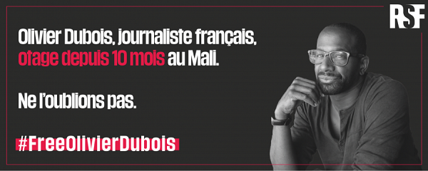 Fév 2022 : "Cela fait dix mois cette semaine que le journaliste Olivier Dubois est retenu en otage au Mali. A cette occasion, RSF a proposé aux grandes chaînes françaises et francophones de télé et de radio de diffuser un message de soutien au journaliste.