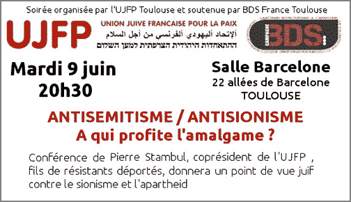 Cette agression injustifiable n’est sans doute pas sans rapport avec la conférence organisée par l’UJFP et le comité BDS (Boycott, Désinvestissement Sanctions tant que Israël ne se conforme pas au droit international) que Pierre Stambul a donnée à Toulouse le 9 au soir.