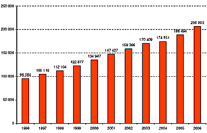 [Le graphique suivant illustre l’affirmation précédente de Sebastian Roché : il met en évidence l’évolution du nombre de violences physiques « non crapuleuses » – c’est à dire dont l’objet n’est pas le vol – enregistrées entre 1996 et 2006 [4].]