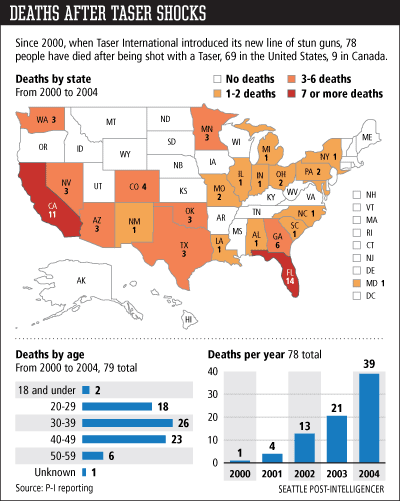 La carte suivante représente le nombre de morts supectées d’être dues au pistolet-non-létal-et-propre entre 2000 et 2004 aux Etats-Unis (source : Seattle Post-Intelligencer du 1er décembre 2004 : « Is non lethal Taser deadly ? ») :