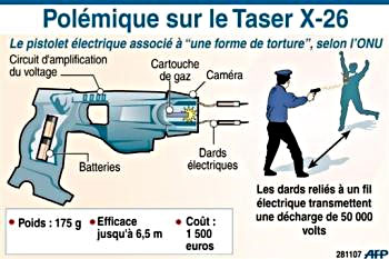 Utilisé depuis 2004 en France par l’armée, la police et la gendarmerie, le Taser X-26, vient d’être autorisé pour les polices municipales [2]. Qualifié d’arme « anti-bavure » et « non-létale » par ses distributeurs, le Taser reste contesté par plusieurs organisations humanitaires qui réclament un moratoire sur son utilisation.