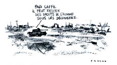 La censure ne masque pas l’horreur. Sous nos yeux, une capitale (Grozny, 400 000 habitants) a été rasée pour la première fois depuis 1944 quand Hitler punit Varsovie. L’étiquette "lutte antiterroriste" ne saurait coiffer une telle inhumanité. L’état-major russe prétend lutter contre une poignée de terroristes qu’il chiffre entre 700 et 2 000 combattants. Qu’aurions-nous dit si le gouvernement anglais avait bombardé Belfast ou le gouvernement espagnol Bilbao, sous prétexte de réduire l’IRA ou l’ETA ? Le sac de Grozny, des villes et des villages de Tchétchénie, se repaît du silence mondial. Les femmes, les enfants, tous les civils tchétchènes sont-ils moins dignes de respect que le reste de l’humanité ? Sont-ils encore considérés comme des êtres humains ?