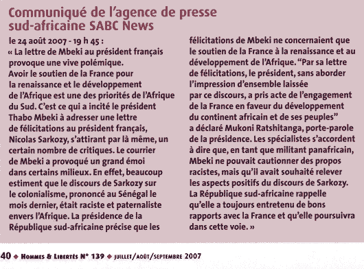 On se rappelle que le discours de Nicolas Sarkozy à Dakar le 26 juillet 2007 avait été particulièrement mal reçu en Afrique. La surprise a donc été grande quand l’Elysée a rendu publique une lettre du 13 août 2007 de Nicolas Sarkozy à Thomas Mbeki, président de la République sud-africaine, lettre qui débutait ainsi [3] :