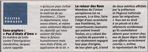 M. V., Var-Matin, le 30 janvier 2008Les Roms squatters recueillis dans les paroisses : les associations caritatives ont hébergé le groupe dans des églises avant que vingt-quatre ressortissants repartent en Roumanie.