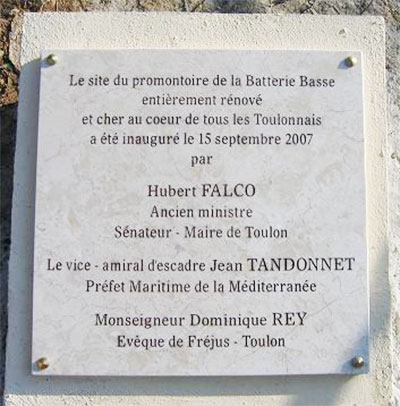 Les plaques d’inauguration fleurissent sous Hubert Falco. En voici une, située au début du chemin qui permet de gagner la chapelle du Cap Falcon (quartier du Cap Brun) qui héberge la statue de “Notre-Dame du cap Falcon, près d’Oran, rapatriée d’Algérie” [6] :