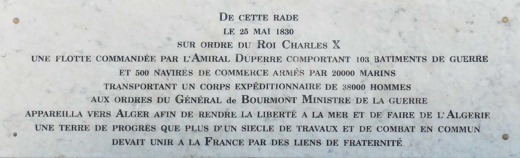 « Quelque jugement que l’on puisse aujourd’hui porter sur cette page d’histoire de la France, l’historien de Toulon ne saurait la sous-estimer. C’est en ces murs et dans cette rade que l’expédition s’est préparée, portant l’activité de la ville à un degré inouï, c’est de ce port que sont partis (le 25 mai 1830) et c’est là que sont revenus les navires de guerre, mais aussi de courrier, et de ravitaillement. » (Maurice Agulhon, Histoire de Toulon — Privat éd. 1980)
