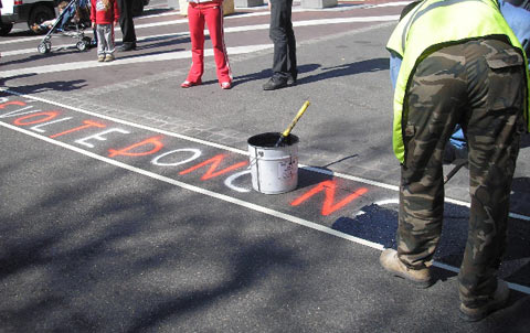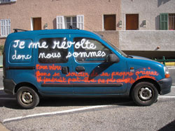 Ce dernier spectacle, dès 9 heures du matin, a déclenché l’irritation du maire récemment élu qui a fait aussitôt intervenir les services techniques pour masquer des textes inscrits sur les marges de la chaussée en les recouvrant de goudron.