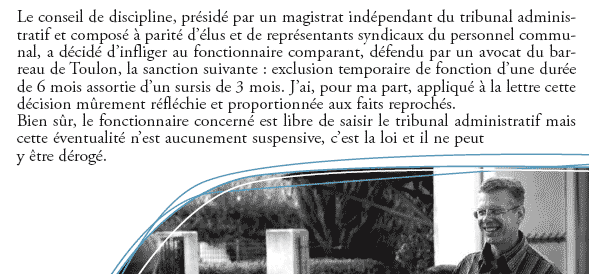 Une mise à pied de trois mois, sans rémunération, pour « avoir fait état dans les colonnes du journal Var-matin du 11 octobre 2005 (...) de sa rancoeur à l’encontre » du maire de La Garde et d’avoir « manqué à son obligation de réserve dans des conditions de nature à nuire à l’image et à porter préjudice au premier magistrat de la ville » (décision en date du 2 mars 2006).