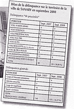 Il n’est pas possible de se référer à un rapport dont les conclusions sont d’ailleurs fortement contestées, dans la mesure où il n’a pas été rendu public. Mais on trouve des chiffres qui semblent témoigner de la baisse de la délinquance à Sanary dans le N° 115, novembre-décembre 2008, de la revue municipale Mieux vivre à Sanary [1]. D’après le tableau qui comporte des chiffres de la délinquance pour septembre 2007 et septembre 2008, la “délinquance de proximité” aurait baissé à Sanary de 39 % en un an : le nombre d’événements serait passé de 90 à 55 – mais dans ces totalisations, les vols dans les véhicules (vols à la roulotte) comptent pour plus de la moitié, passant de 57 à 32. En y ajoutant quelques autres délits – l’usage de stupéfiants qui passe de 16 à 20 et le délit de travail clandestin qui diminue de 7 à 1 – le mensuel municipal se permet de conclure qu’en un an la délinquance générale aurait baissé de 10 %... Comment accorder le moindre crédit à des conclusions qui reposent sur des études aussi frivoles ?
