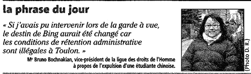 La décision motivée du 15 octobre ne fait pas état de l’obtention du diplôme de master 2 de la jeune femme, avec mention passable. Bing a encore la possibilité de faire un recours gracieux auprès du préfet du Var et un recours hiérarchique auprès du ministre de l’Intérieur. Dans le cas où l’arrêté serait abrogé, l’Etat lui paiera-t-il son billet de retour ? Me Bruno Bochnakian, vice-président de la section toulonnaise de la Ligue des droits de l’Homme, avocat au barreau de Toulon, « n’a jamais vu un préfet payer le billet de retour à un ressortissant reconduit à la frontière ».