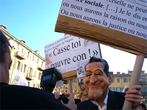 Deux professeurs des écoles qui participaient à une manifestation à Nice jeudi 21 janvier 2010 ont été interpellés parce qu’ils portaient un masque de Nicolas Sarkozy et brandissaient une pancarte sur laquelle était inscrit le fameux “casse-toi pauvre con”, rapporte Nice-Matin.