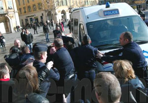 De leur côté les pompiers évacuaient un blessé côté manifestants qui s’est vu prescrire 8 jours d’ITT à l’hôpital Saint-Roch [1]. Pendant ce temps, la nouvelle de cette triple interpellation avait fait le tour de la manif. Provoquant une indignation générale. Ainsi, une enseignante d’histoire s’interrogeait à voix haute : « Mais dans quel pays vivons-nous ? La liberté d’expression et de manifester serait-elle remise en cause ? »