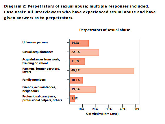Comme en France, la majeure partie des victimes a été violentée par des gens qu’elles connaissaient (49.3% par des partenaires ou ex partenaires, 53.9% par des connaissances, 10.1% par des membres de leur famille) ; seules 14.5% d’entre elles ont été sexuellement agressées par des inconnus [1]