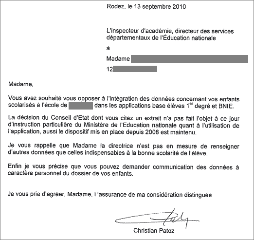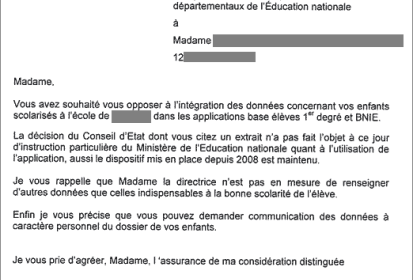 Mais y a-t-il une volonté du ministère de respecter la décision du Conseil d’État ? On peut poser la question à la lecture de la lettre reproduite ci-dessous adressée le 12 septembre dernier par l’Inspection académique de l’Aveyron à une mère d’élèves qui demandait que ses enfants ne soient pas répertoriés dans Base élèves.
