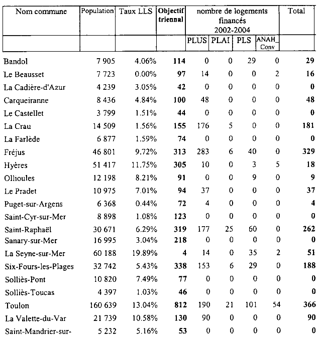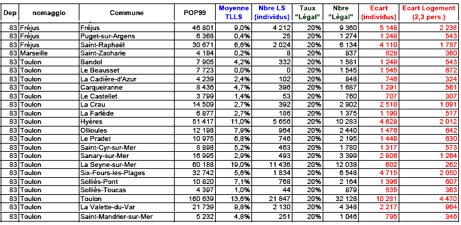 Un document [2] donne la liste des communes soumises à l’article 55 de la loi SRU au 1er janvier 2005 d’après les données 2004. Voici ce qui concerne le département du Var :