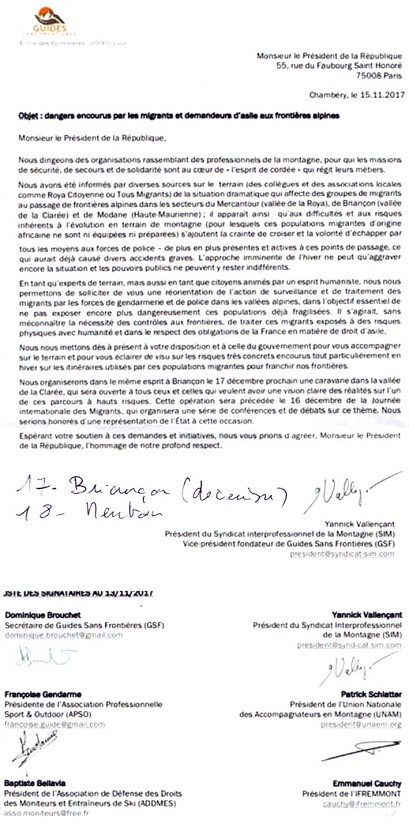 Dénonçant les dangers encourus par les migrants et les demandeurs d’asile aux frontières alpines, les professionnels de la montagne ont demandé au Président de la République, "en tant d’experts de terrain mais aussi en tant que citoyens animés par un esprit humaniste", de "réorienter l’action de surveillance et de traitement des migrants par les forces de police et de gendarmerie dans les vallées alpines afin de ne pas exposer encore plus dangereusement ces populations déjà fragilisées."