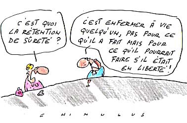 « La loi du 25 février 2008 relative à la rétention de sûreté fait rupture dans notre tradition juridique. Elle permet l’incarcération dans des établissements spéciaux de personnes condamnées qui, bien qu’ayant purgé leur peine, seront privées de liberté du fait de leur “ particulière dangerosité ”. Pour la première fois dans notre droit, des individus pourront être enfermés sur décision judiciaire non pour sanctionner des actes délictueux ou criminels, mais pour anticiper des actes qu’ils n’ont pas commis ! ... »