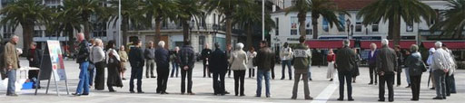 Premier cercle à Toulon, le 30 octobre 2008 : "Le premier Cercle de silence s’est déroulé jeudi 30 octobre, place de la Liberté. A midi, en dépit d’une pluie fine, une petite dizaine de personnes ont esquissé un petit cercle, qui devait s’agrandir à une cinquantaine de Varois – notamment des membres de l’Acat."