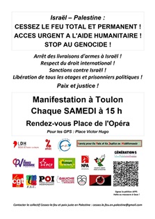 Rassemblement samedi 30 mars à 15h, place de l’Opéra, Toulon pour demander le cessez-le-feu total, l’accès urgent à l’aide humanitaire, la libération des otages et des prisonniers politiques.