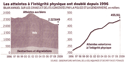 Le tableau collecté par l’Observatoire national de la délinquance et des réponses pénales (ONDRP) reste cependant contrasté. Les violences aux personnes (455 911 faits constatés en 2009) ont augmenté de 2,8 %, et dans la catégorie des atteintes aux biens (2,2 millions de faits, en diminution de 0,7 %), les cambriolages ont progressé de 8,2 % et les vols à main armée de 15,8 %. Manquent à l’appel les chiffres sur les véhicules incendiés, "pas encore prêts".