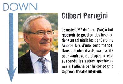 vis-à-vis de Caroline Amoros. La commune n’a signé aucun contrat avec cette personne [1]. L’association Orphéon a également accès à toutes les installations culturelles mais je ne reconnais plus à sa présidente le droit d’organiser sur la place publique des représentations comparables à celles du 29 mars 2008. Je considère l’association entièrement responsable des débordements qui se sont produits, des dégradations et de l’outrage public au drapeau national. Il entre dans nos intentions de revoir les termes de la convention signée quelques semaines avant la fin du mandat de l’ancienne municipalité. La programmation de la salle de l’Abattoir sera revue. La bibliothèque Armand Gatti peut continuer à fonctionner comme actuellement. Je n’ai aucun litige avec Mme Amoros. Par contre j’ai déposé plainte contre la présidente d’Orphéon. Je laisse le soin à M Le procureur de la République de sa recevabilité. Aujourd’hui il n’est pas question que je retire ma plainte ».Corinne Prenat