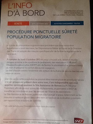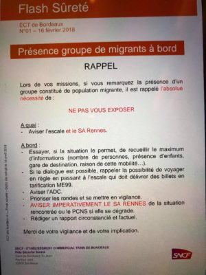 2018 : Suite à la note (voir supra), diffusée en interne aux contrôleurs, leur demandant d’identifier les migrants à bord des trains et dans les gares, la CGT a demandé une audience à la direction locale de la SNCF.