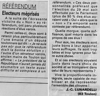 Var-Matin publie une lettre de lecteur qui, après avoir évoqué la récente "affaire du RER D" [2], se termine ainsi :