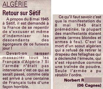 La date est importante : le lendemain, dimanche 15 août 2004, devait se dérouler à Toulon, en présence du président algérien, la commémoration officielle du soixantième anniversaire du débarquement de Provence. Le jour habituel de parution de la rubrique "paroles de lecteurs" est le lundi, mais, en page 7 de l’édition de Toulon du samedi 14 août, on a pu lire le petit article suivant, non signé :