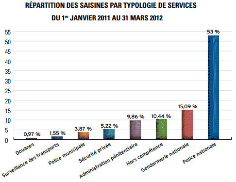 4° Par toute personne qui a été victime ou témoin de faits dont elle estime qu’ils constituent un manquement aux règles de déontologie dans le domaine de la sécurité ». Ainsi, le filtre qui s’opérait avant le 1er mai 2011, date de l’entrée en vigueur de la loi précitée pour la déontologie de la sécurité, n’existe plus, ce qui explique le doublement du nombre de saisines.