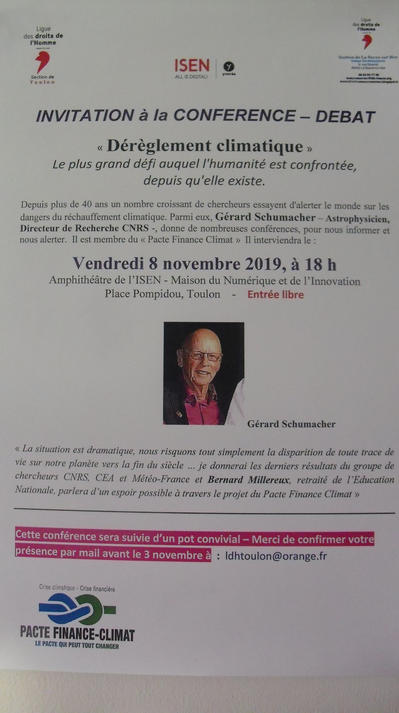 "Dérèglement climatique" : la LDH Toulon et la LDH la Seyne s/Mer vous invitent à la conférence de Gérard Schumacher le 8 novembre, à 18h, à l’ISEN (Toulon)