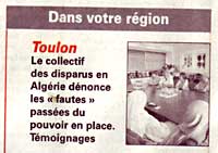 Hier à Toulon, trois femmes dont l’un des proches, un frère, un mari, un enfant... ont disparu en Algérie à l’époque de la guerre civile dans les années 90, ont été reçues en mairie de Toulon par Hélène Noir, (8e) adjointe au maire, et Colette Gluck, conseillère municipale, à l’initiative de la section locale de la Ligue des droits de l’homme. Objectif, obtenir un soutien de la France dans leur quête de la vérité auprès des autorités dirigées par M. Bouteflika à l’heure de la « réconciliation nationale ». (La Marseillaise)
