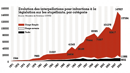 Quarante ans après la loi fondatrice du 31 décembre 1970 réprimant l’usage de drogues, la répression des infractions à la législation sur les stupéfiants atteint des niveaux inédits : 160.000 interpellations ont été recensées en 2009 par les services de police et de gendarmerie, très loin de la première année d’application de la loi (2.592 interpellations), trois fois plus qu’au début des années 1990.