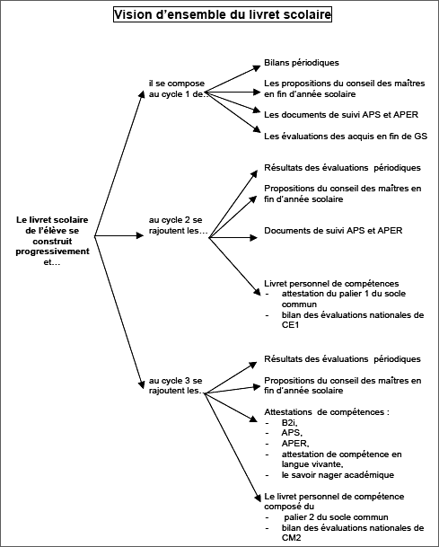 Plus concrètement : « En fin de CE1 et de CM2 » [puis en fin de troisième] « les enseignants font un bilan complet de toutes les acquisitions faites au cours du cycle [...].Ces bilans permettent d’évaluer l’acquisition du socle commun de connaissances et de compétences, c’est-à-dire les savoirs fondamentaux que tout élève doit maîtriser à la fin de la scolarité obligatoire. Ils sont consignés dans un livret personnel de compétences, ajouté au livret scolaire. » [5]