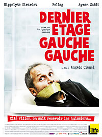 Parce qu’elle présente un huissier bâillonné dans une baignoire, avec pour sous-titre « Cité Villon, on sait recevoir les huissiers… », l’affiche du long-métrage d’Angelo Cianci Dernier étage, gauche, gauche a été l’objet d’une action en justice de la part de la Chambre nationale des huissiers de justice qui réclame son retrait.