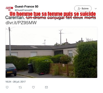 "Un drame conjugal fait deux morts à Carentan" titrait "Ouest France" le 28 juillet sur son site internet. Ce titre fait réagir sur Twitter.